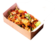 Vištienos filė su sūriu,bulvytės FRI,pekino kopūstai,švieži agurkai,pomidorai,pasirinktas padažas.