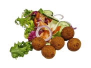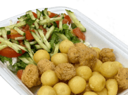 Bulvių rutuliukai,vištienos rutuliukai,pekino kopūstai,švieži agurkai,pomidorai,pasirinktas padažas.