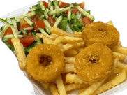 Vištienos kepsneliai,fri bulvytės,pekino kopūstas,agurkas,pomidoras,pasirinktas padažas