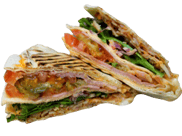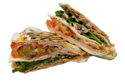 kumpis, salotos, vištiena / jautiena, marinuoti agurkai, pomidorai, raudoni svogūnai, lydomas sūris.